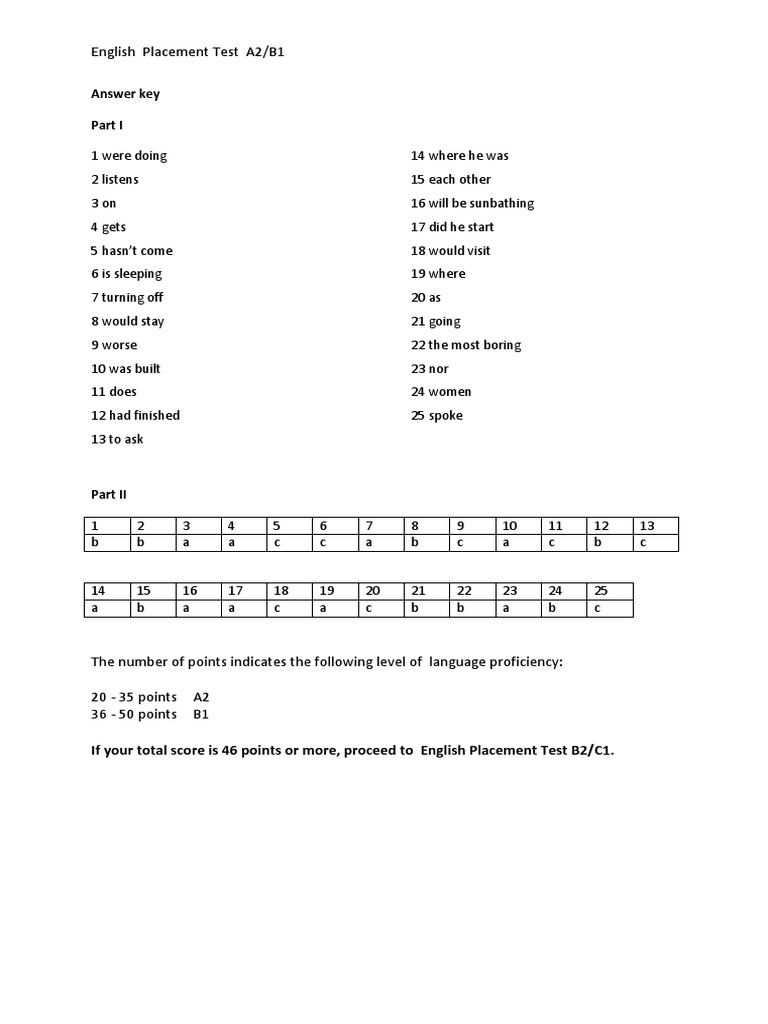 The A2B1 Placement test consists of 50 questions worth one point each which can help you determine your if you are ready to move to the next level or need to review a few more pointsPlease note though that this is just a guide to help you. A2 B1 Level Grammar Tests Exercises Free Online English Tests Quizzes. Please take this test without consulting any outside materials in order to get the most accurate.