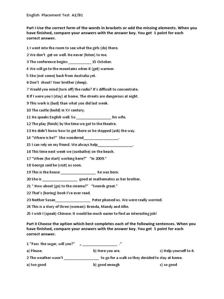Mark your answers on the answer sheet. This free English vocabulary test in PDF format may be used by teachers and schools to check a students English vocabulary level. English Placement Test A2B1 Part I Use the correct form of the words in brackets or add the missing elements.